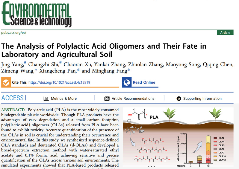 近日,该研究团队进一步攻克了土壤这一更为复杂的基质,建立了聚乳酸低聚物的精准检测方法,并初步揭示了其在土壤环境中的迁移转化规律,为后续研究低聚物的长期环境行为及生态风险奠定了重要基础。论文以“The analysis of polylactic acid oligomers and their fate in laboratory and agricultural soil”为题,发表于美国化学会杂志Environmental Science & Technology,方明亮、潘翔城、王梓萌为共同通讯作者。工作得到了国家重点研发计划、中科院先导项目、国家自然科学基金委优青项目、以及小米青年学者、仲英青年学者、安捷伦等方面的资助。论文第一作者杨婧、时长志现分别为复旦大学环境系硕士生、博士生,寡聚体的同位素标记得到南京大学江伟团队的支持。