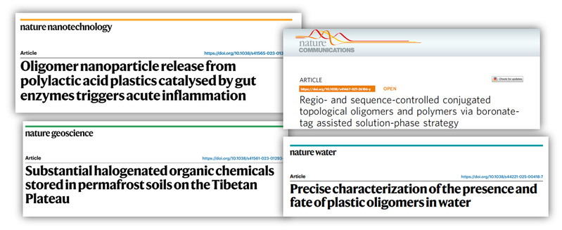 环境系方明亮教授团队发现,聚乳酸在模拟胃肠环境下可释放低聚物,这些分子能够与锌离子指结构域高亲和力结合,干扰基质金属蛋白酶的活性,从而可能影响肠道健康,提示可降解塑料的低聚物可能具有未被充分认识的生物效应,亟需建立更系统的环境风险评估方法(Nature Nanotechnology 2023)。但低聚物的研究面临一大瓶颈即缺乏高纯度的标准品,高分子系潘翔城教授团队开发的硼酯保护基精准合成策略,实现了低聚物的可控合成,为后续毒理学和环境行为研究提供了关键工具(Nature Communications 2021)。环境系王梓萌教授团队长期关注水土环境中非稳态和结合残留态新污染物的迁移转化规律,为塑料低聚物在真实环境中的归趋和效应研究提供了技术支持(Nature Geoscience 2023,复旦大学十大科技进展)。近期,该团队合作开发的“Oligomer-Finder”分析平台,结合液相色谱-高分辨质谱与非靶向数据挖掘技术,显著提升了低聚物在水体中的筛查能力(Nature Water 2025)。