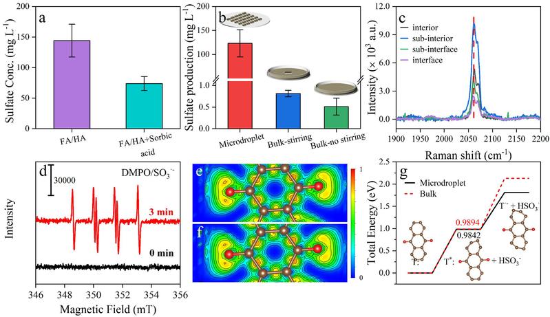 图1. (a) 微液滴中硫酸盐的淬灭实验(山梨酸)。(b) 不同反应系统中光敏硫酸盐的生成。(c) D =~30 μm的HULIS微液滴内部拉曼位移(C≡N)的空间特征。(d) HULIS 产生的SO3·-的特征。界面(e)和体相(f)中激发态蒽醌分子(芳香羰基)的电子局域函数图(ELF)。(g) 蒽醌水溶液在界面和体相中光敏SO2氧化过程的总能量变化。