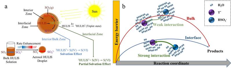 图2. 反应机理示意图。(a)空气-水界面和内部体相区域SO2光敏反应示意图。(b)空气-水界面和体相的半溶剂化和溶剂化效应的概念图,以及反应过程的能垒示意图。