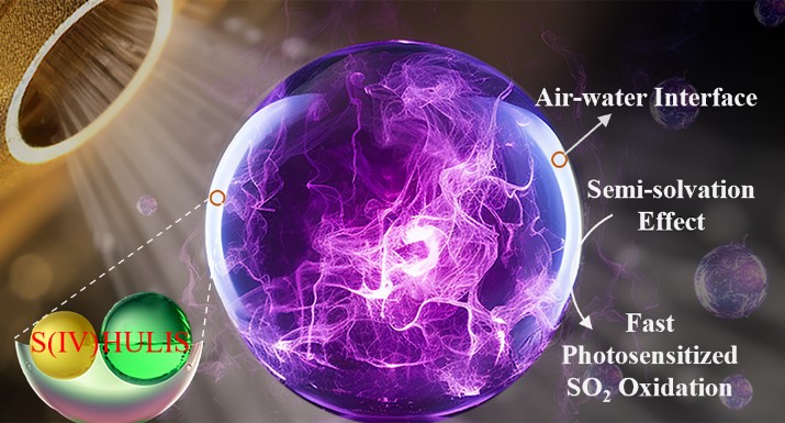 本研究利用一种尺寸可控的微液滴打印设备以实现粒径均一可控的实验和分析,实现了微液滴内显著加速的光敏化反应的尺寸依赖性动力学参数化。数值模拟结果表明,与传统体相过程相比,在云和气溶胶相关的尺寸颗粒中硫酸盐形成速率增加了3-4个数量级。结合系列实验和密度泛函理论(DFT)计算阐明了界面半溶剂化效应加速大气光敏化氧化反应的作用机理(图 1)。界面半溶剂化效应通过显著降低具有开放溶剂壳的空气-水界面区域中的反应过程所需的去溶剂化能垒,从而加速大气光敏化氧化反应。在气-液界面中,不完全溶剂化的3HULIS*由于具有开放溶剂壳,可以更容易克服去溶剂化能垒从HSO3-中捕获电子,其方式比在被水分子完全阻断的本体介质中更有效。总而言之,丰富的空气-水界面处不完全溶剂化产生的极化场更有利于反应物之间的有效相互作用,如电子转移过程,从而加速反应进行,这为大气快速化学反应形成提供了一个新的视角(图 2)。