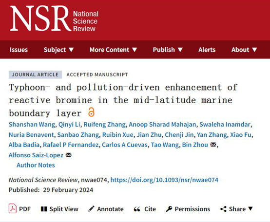 近日,我系王珊珊副教授、周斌教授课题组与西班牙国家研究委员会Alfonso Saiz-Lopez教授团队合作在《国家科学评论》(National Science Review)上发表了题为“Typhoon- and pollution-driven enhancement of reactive bromine in the mid-latitude marine boundary layer”的论文。该论文揭示了台风天气和空气污染对中纬度海洋边界层中活性溴含量的显著影响,为此前被低估的活性溴在大气化学、区域空气污染和全球气候变化中的作用带来了新的见解。Bet365中文版app-Bet365手机版下载 王珊珊副教授和西班牙国家研究委员会/香港理工大学/山东大学的李沁怡博士为第一作者,Bet365中文版app-Bet365手机版下载 周斌教授和西班牙国家研究委员会的Alfonso Saiz-Lopez教授为通讯作者。
