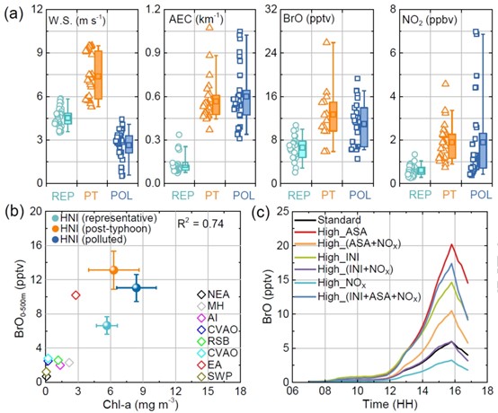 Bet365中文版app-Bet365手机版下载 的研究团队使用自主研发的多轴差分光学吸收光谱(MAX-DOAS)技术,于2018年夏季在中国东海的花鸟岛观测了活性溴及其他活性成分的大气浓度水平。观测期间研究人员记录到了前所未有的高浓度氧化溴(BrO),这是表征活性溴的一个关键指标。研究发现,白天平均浓度为9.7±4.2 pptv,受台风影响时峰值浓度可达26 pptv,台风期间的风速增加放大了SSA的排放,进而通过SSA的脱溴显著增强了大气中的活性溴(图1和图2a)。BrO与叶绿素-a(Chl-a)浓度之间的正相关关系表明海洋生源排放是溴的有机来源(图2b)。此外,研究团队还发现在高NOx条件下BrO浓度会有所升高,表明存在由大气污染引起的SSA释放溴的机制。通过箱模式模拟,揭示了NOx在控制BrO水平中的竞争作用:一方面,NO2与BrO发生反应,直接降低BrO浓度;另一方面,NOx可增加硝酸盐浓度及其光解,从而加快SSA的活化,进一步释放无机溴,间接增强了BrO水平(图2c)。