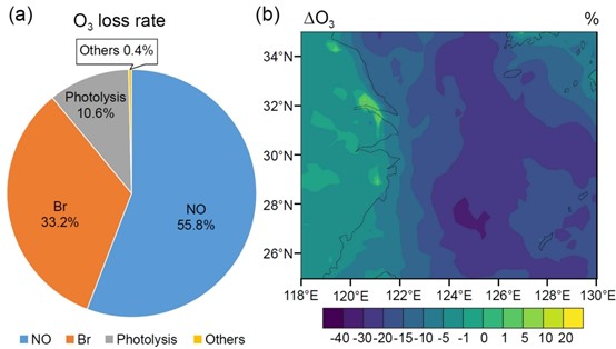 研究团队结合观测约束的一维模型(THAMO)模拟,发现溴化学是花鸟岛O3消耗总量的第二大贡献成因(33.2%),仅次于NO滴定效果(55.8%)(图3a)。这表明如果不考虑溴化学作用,可能会忽视我国沿海区域臭氧消耗的一个重要途径。此外,大气化学传输模式模拟结果表明,大气中溴含量的增加可以降低中国东海的臭氧浓度,但同时会增加陆地沿岸地区的臭氧浓度,对沿海空气质量和大气氧化能力造成显著且复杂影响(图3b)。北半球存在频繁的气旋活动,而以往研究中并没有考虑气旋活动对海洋溴化学的增强作用,溴化学在区域和全球环境的作用可能被低估。