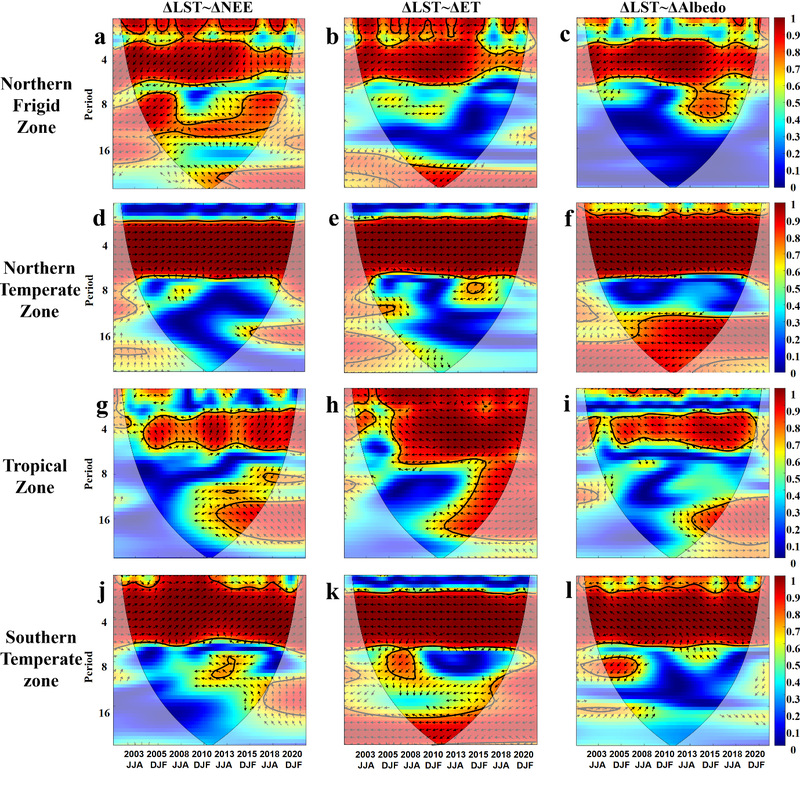 主要研究发现如下:1. 全球森林局地气候效应的气候带差异显著:北方森林全年呈现显著增温效应(+1.99°C),主要由夜间增温驱动,与净生态系统交换(NEE)和蒸腾(ET)路径密切相关。温带森林白天降温效应显著(北半球-0.48°C,南半球-0.91°C),但冬季转为增温,降温主要依赖碳汇(NEE)路径。热带森林全年稳定降温(-2.11°C),主要由蒸腾作用主导,且近20年效应波动极小。2. 长期趋势与机制解析。2001—2021年间,北方森林增温效应以每年+0.03°C的速率缓慢增强,可能与气候变暖加剧干旱有关;而热带森林的降温效应则保持高度稳定。生物物理(蒸腾、反照率)与生物地球化学(碳汇)路径的协同作用,是森林调控温度的关键。增强的蒸腾与反照率可同步放大降温效应,而碳汇减少则对局地降温具有非同步但显著的全球尺度影响。3. 跨尺度验证。通过小波相干分析,研究发现森林的温度调控效应与关键环境变量(NEE、ET、反照率)在年际尺度上存在强关联,进一步验证了多路径协同作用的时空规律。