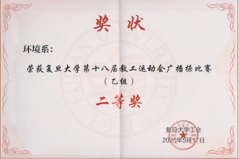 从4月初组成广播操比赛团队,老师们经过一个多月的训练,通过4月29日初赛和5月16日决赛两轮比赛,环境系在复旦大学第十八届教工运动会广播操比赛(乙组)中获得二等奖。