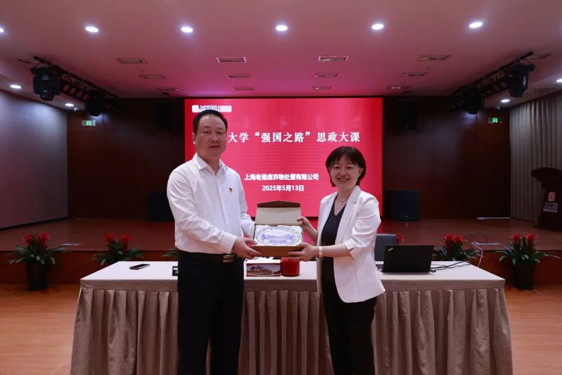 张晓清书记代表环境系向老港处置公司赠送复旦大学120周年校庆纪念品,共谱校企情谊新章。