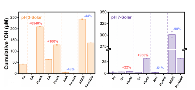 通过研究单组分系统和复合系统(铁氧化物与有机物的多种组合),研究发现低分子量有机酸如柠檬酸(CA)和草酸(OA),在与铁氧化物结合时能够显著增强•OH的生成。这一作用的增强主要源于光子吸收效率的提高以及电子转移过程的促进。而具有芳香共轭结构的有机物,如腐殖酸(AHA)和蒽醌(AQDS),表现出显著的光敏化行为,可通过激发态参与界面反应,则铁氧化物反而抑制•OH的生成。双重角色揭示了矿物反应性与有机物分子结构之间的复杂作用关系。