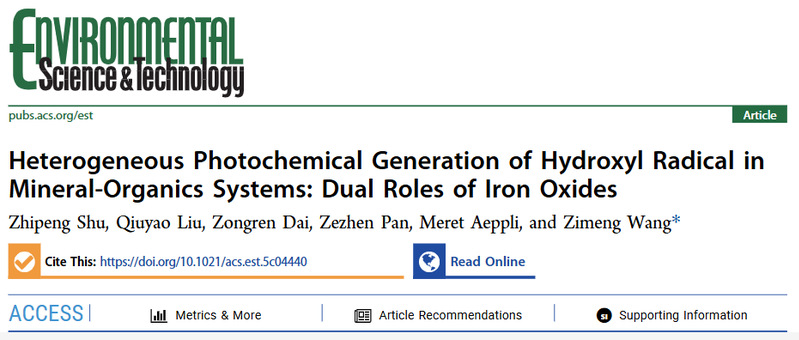 Shu, Z.; Liu, Q.; Dai, Z.; Pan, Z.; Aeppli, M.; Wang, Z.* Heterogeneous photochemical generation of hydroxyl radical in mineral-organics systems: Dual roles of iron oxides Environmental Science & Technology 2025, doi.org/10.1021/acs.est.5c04440