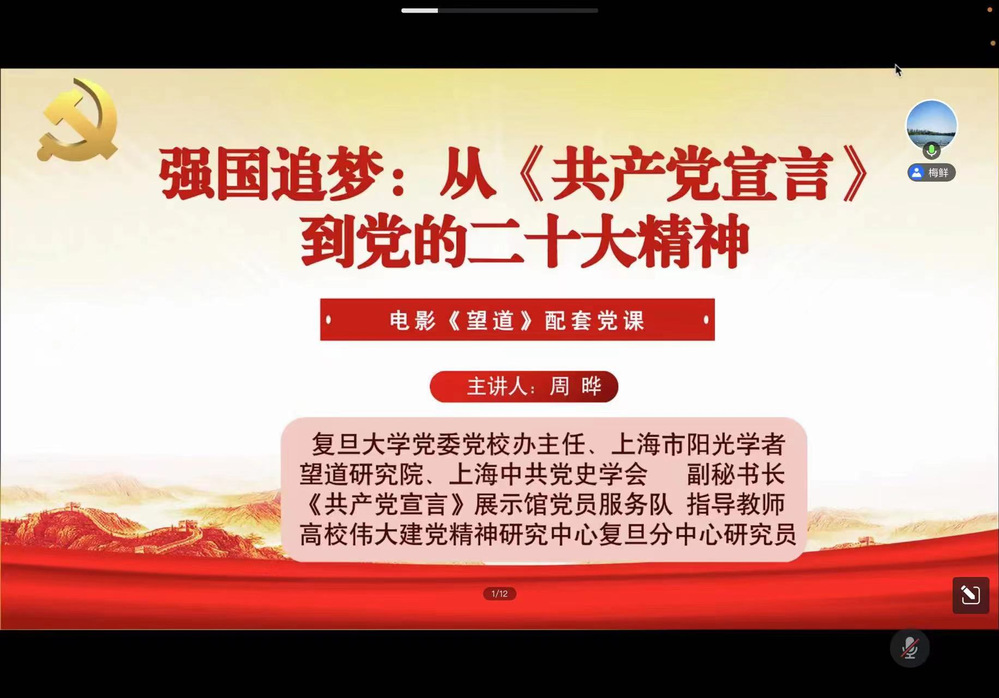 为深入学习宣传贯彻党的二十大精神,把党员干部师生群众思想和行动统一到党的二十大精神上来,落实学校《关于认真学习宣传贯彻党的二十大精神的通知》以及系党委工作安排,2022年12月13日,Bet365中文版app 党委组织举办党的二十大精神学习辅导报告第二讲,邀请“复旦大学党的二十大精神宣讲团”成员、校党委党校办主任兼《共产党宣言》展示馆党员服务队指导教师、高校伟大建党精神研究中心复旦分中心周晔研究员做专题党课讲解,该党课同时为电影《望道》配套党课。系党委书记梅鲜同志主持,Bet365中文版app 和大气与海洋科学系全体教职工、退休党员、学生党员参加学习。