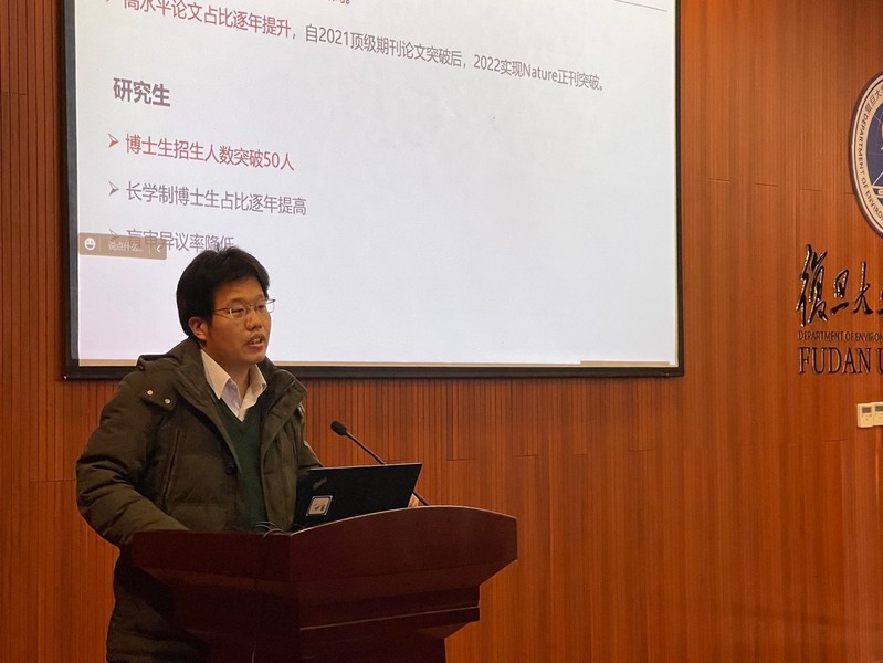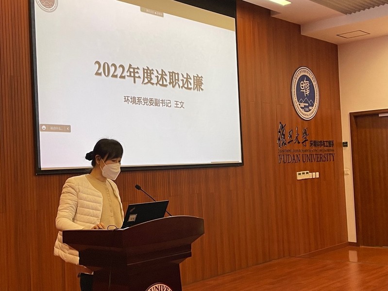 2022年度全系年终大会在复旦大学江湾校区环境科学楼1021报告厅召开。环境系党政领导班子成员做述职报告,环境系全体教职员工、博士后和科研助理线上线下参加了会议。会议由副系主任安东老师主持。