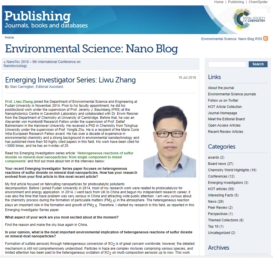 近日,英国皇家化学会纳米环境类刊物 Environmental Science: Nano 宣布我系张立武教授入选 Emerging Investigator Series。张立武教授的关于颗粒物内混合组分非均相研究工作成果被遴选为Environmental Science: Nano今年第八期封面论文,并入选Emerging Investigator Series,其个人介绍及采访与论文同时刊登。