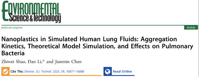 近日,我系李丹教授课题组在Environmental Science & Technology上发表题为“Nanoplastics in Simulated Human Lung Fluids: Aggregation Kinetics, Theoretical Model Simulation, and Effects on Pulmonary Bacteria”的研究论文,并被选为内封面文章(supplementary cover)。呼吸吸入是人体暴露纳米塑料的重要途径之一,然而其在肺部复杂微环境中的行为及潜在毒性仍缺乏系统研究。本研究通过模拟健康与炎症状态下的人体肺液,系统探讨了不同粒径与表面修饰的聚苯乙烯纳米塑料(PSNPs)的凝聚行为、相互作用机制,以及对肺部原生与致病菌的毒性效应。结果表明,PSNPs在炎症人工溶酶体液(artificial lysosomal fluid, ALF)中均发生凝聚,而未表面修饰和羧基修饰的PSNPs在健康的Gamble溶液(Gamble’s solution, GS)和添加肺表面活性剂的Gamble溶液(modified GS, MGS)中保持稳定。冗余分析表明,PSNPs的凝聚减轻了其对细菌的氧化应激和膜损伤。氨基修饰的PSNPs在GS中可诱导持续的氧化应激,损伤细菌的细胞膜,并促使致病铜绿假单胞菌释放绿脓菌素升高至对照组的2.16倍。此外,塑料老化过程显著增强了PSNPs对肺部细菌的毒性。本研究为纳米塑料在肺部中的行为和毒性作用提供了新见解。