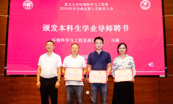 今年环境系选派人才工程队员刘品皓、专职辅导员吴旭炀、青年教师蔡润龙分别担任2024级环境系本科生、硕士生、博士生班级辅导员。系党委书记张晓清为2024级新生辅导员颁发聘书。