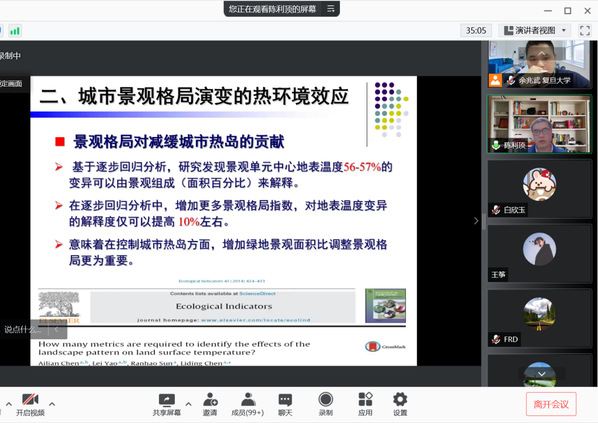 陈利顶研究员的精彩报告引起了与会老师和同学们的热烈讨论。余兆武老师首先对整个报告做了总结,并表示陈利顶研究员的报告令他回味无穷。复旦大学硕士生李思恒同学提问:绿地变不透水面的增温效应强于不透水面恢复绿地的降温效应,这背后潜在的机制是什么?陈利顶研究员表示,这和生物量和土壤有关系。原来绿地的覆盖率比较高、生物量较大,增温效果相对较好。人工的改造过程还会对土壤产生影响,造成蓄水、温度调节等功能的差异,所以绿地和不透水面相互转化会造成降温效果变化。复旦大学博士生谢伟提问,面对碳减排的局势和相关环境问题,城市区域面向未来的发展如何从考虑改造景观格局角度寻找新思路?陈利顶研究员表示根据自己多年的研究,组成和面积在城市中起着决定性作用,景观格局因素是在城市土地资源有限的情况下被迫做出的选择。城市没有再多的土地用于绿化时,景观格局的优化才变得有意义。