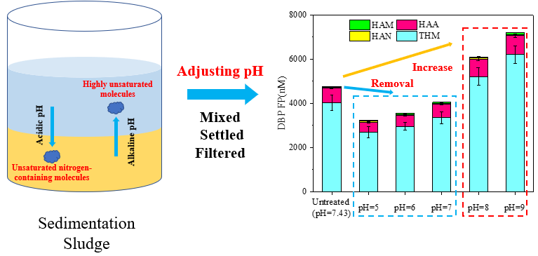 课题组针对水厂生产废水处理和回收利用现状,对上海市占总供水量92%的水厂进行全覆盖研究分析,提出方案解决现行污泥浓缩和废水回收利用等问题,按照“一厂一策”的原则提出《上海市水厂生产废水回用方案》,研究成果在包括月浦、泰和、闸北、杨树浦、南市、长桥、徐泾、闵行、罗泾、金山海川等11家水厂开展应用。课题组研究提出了生产废水的风险识别方法,利用傅里叶变换离子回旋共振质谱(FT-ICR-MS)对典型存在的风险有机物进行识别,证实生产废水中低、中、高分子量有机物的组成规律。研究发现卤乙腈(HAN)和卤代乙酰胺(HAM)生成潜能与高度不饱和含氮化合物高度相关,此类化合物在弱酸性条件下被高效去除,解释了生产废水中DBP前体物的去除机理,研究成果分别发表在Water Research,2021,194(116964)和Water Research,2020,186(116346)。在此基础上,研究提出生产废水pH科学调控方案,经调控后,形成的污泥絮体显著增加了对低分子量有机物的吸附去除,进而调控DBP前体物的去除,三卤甲烷(THM)、卤乙酸(HAA)、卤乙腈(HAN)和卤代乙酰胺(HAM)生成潜能降低9–26%,全面实现生产废水回用过程中DBP生成风险管控,该研究成果发表在Resources, Conservation & Recycling, 2022, 179(106135)上。针对水厂超滤膜生产废水的资源化回用,课题组开展了从中试到生产性试验的研究,开展了为期4个多月的超滤膜处理中试规模(10 m3/h)适应性研究,考察超滤技术对上海市罗泾水厂滤后水的处理效果、回用水质安全性、工艺运行的稳定性及系统运行能耗、药耗,为罗泾水厂超滤膜深度处理工程提供第一手技术资料和设计依据。罗泾水厂新建膜处理工程造价3亿,项目由复旦大学、上海市政设计研究总院和上海城投水务有限公司承担。
