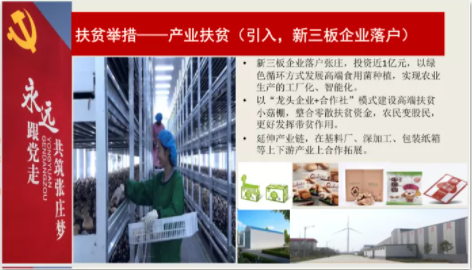 新三板企业落户张庄,投资近1亿元,以绿色循环方式发展高端食用菌种植,实现绿色生产的工厂化、智能化。以“龙头企业+合作社”模式建设高端扶贫小菇棚,整合零散扶贫基金,农民变股民,有效地整合了零散扶贫基金。延伸产业链,在基料厂、生加工、包装纸箱等上下游产业上合作拓展。
