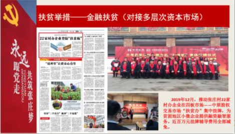 2019年12月,推动张庄村22家村办企业在四板市场——中原股权交易市场“扶贫办”集中挂牌,为贫困地区小微企业提供融资融智服务。