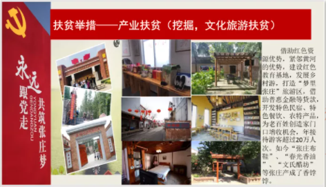 打造“梦里张庄”旅游区,对闲置院落进行美化、建立农家书院、农家产业、开发特色民宿等,发展红色教育、建立培训基地,由家养蛋鸡改变为家养孔雀,很大程度上改善了当地环境。