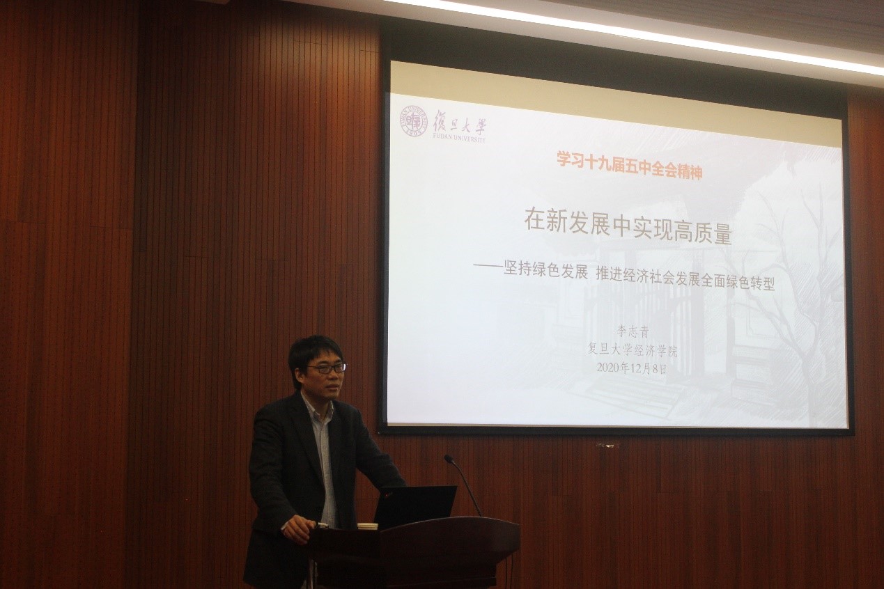 李志青副教授首先阐述了党的第十九届五中全会的重大意义,并从经济、生态环境、农业等十个方面展示了全面建成小康社会所取得的巨大成就。他提到,我国发展环境正面临的深刻复杂变化,即世界正在经历百年未有之大变局、我国已转向高质量发展阶段和发展不平衡不充分问题仍然突出。李志青副教授详细阐述了我国到2035年基本实现社会主义现代化的远景目标以及“十四五”时期我国经济社会发展的指导方针、主要目标和重点任务,强调了要以习近平生态文明思想指导中国绿色发展实践和创新,要充分发挥绿色发展对经济社会发展的重要支撑作用,并为在座师生阐明了新的历史时期绿色发展的新形势。