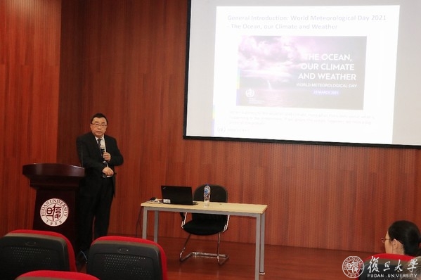 当天下午,支部邀请复旦大学发展研究院、大气与海洋科学系/大气科学研究院高级工程师汤绪为师生作题为“国际气象合作与新时代青年人的责任”的主题讲座。他从今年“世界气象日”的主题切入,介绍了全球气候变暖背景下海洋对天气和气候的影响。今年气象日的主题是“海洋、我们的气候和天气”,是为了纪念世界气象组织(WMO)将地球系统内的海洋、气候和天气列为工作重点。他着重讲述了我国在应对气候变化方面所做的不懈努力和突出贡献,从国际气象合作到人类命运共同体,展现出负责任大国的作为和担当。他勉励同学们将所学所思投入应对气候变化、推动生态文明建设的实践当中,自觉肩负起新时代青年的责任。