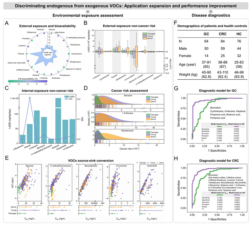 图2. (A) 外源性VOCs的吸入率和脂肪生物利用率;(B) 外暴露非致癌风险;(C) 内暴露非致癌风险;(D) 内外暴露致癌风险;(E) VOCs在人体中的源汇关系;(F) 胃肠道患者和健康对照者的统计信息;(G-H)胃癌、结直肠癌诊断模型。