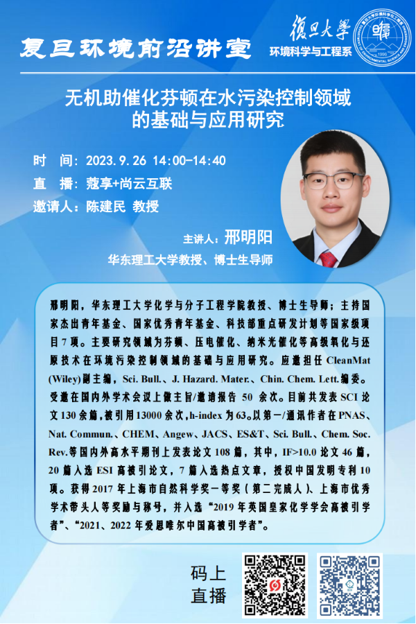 【复旦环境前沿讲堂】无机助催化芬顿在水污染控制领域的基础与应用研究