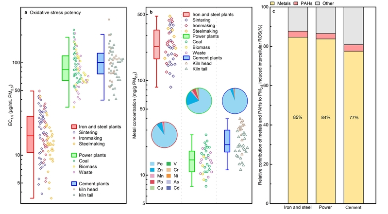 图1:钢铁厂(Iron and steel plants)、电厂(Power plants)和水泥厂(Cement plants)燃烧排放气溶胶(a)氧化应激效应(ROS)、(b)毒性金属组分以及(c)关键化学组分对ROS效应贡献比例解析(金属是工业源气溶胶的主导毒性成分)。