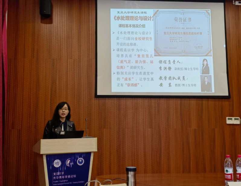 李洪静介绍了“水处理理论与设计”研究生课的建设。该课程以“学”为中心,培养具有“复旦范儿(底气足、能力强、站位高)”的研究生。任课教师采用“启发互动式”教学方法,用环保领域榜样的例子鼓舞学生,还采用“体验式场景”教学模式,受到研究生的欢迎。课程教学案例“绘制新时代中国的水处理设计蓝图”入选《复旦大学课程思政优秀教学案例100》。课程获批复旦大学2022年研究生课程思政项目,并在2023年入选复旦大学首批研究生课程思政标杆课程。