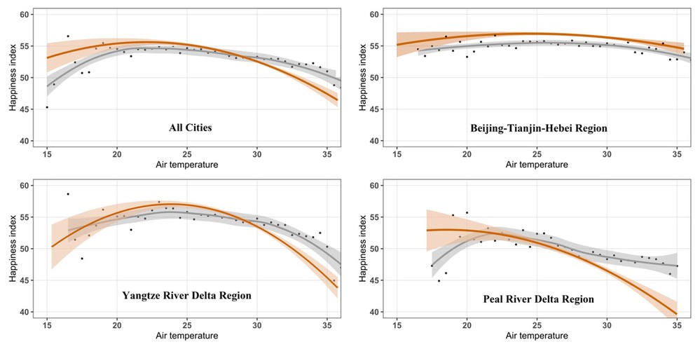 研究基于新浪微博收集了来自44个中国地级市的约6百万条带地理标记的推文,并使用二次回归模型以探索夏季高温与幸福感之间的关系。同时,开发了一个三阶段的分析来检验时空异质性,确定导致城市居民幸福感差异的因素。结果表明,所有城市都呈现出类似的驼峰形状关系,总体最佳温度为22.8°C(昼夜均温)。估计的最佳温度在地理上表现出差异性,京津冀、长三角、珠三角三个城市群的温度阈值分别为25.3°C、23.8°C和20.0°C,呈现由北向南递减趋势。此外,热浪强度每增加一个标准差,居民的表达幸福感(EH)降低0.813(95% 置信区间:0.177,1.449)个标准差。此外本研究还观察到中国北部和经济欠发达城市的居民在夏季高温期间面临着更低的热风险。这项研究为未来关于极端天气事件、城市居民健康和城市可持续发展目标的研究和实践应用提供了新见解。