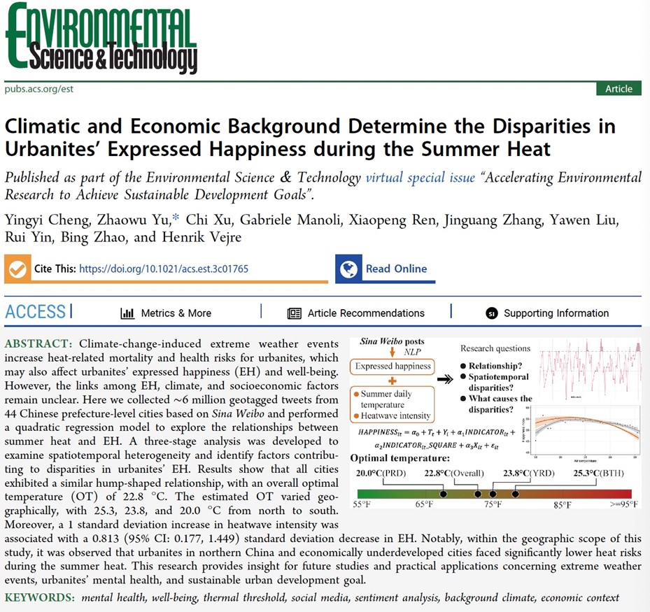 本研究以“Climatic and economic background determine the disparities in urbanites’ expressed happiness during the summer heat”近期发表于ES&T。本研究第一单位为Bet365中文版app-Bet365手机版下载 ,合作单位还包括丹麦哥本哈根大学、瑞士洛桑联邦理工学院、南京大学、中国科学院心理所、南京林业大学等。本研究得到国家自然科学基金面上项目、上海市浦江学者项目、上海市自然科学基金面上项目、中国生态学学会生态学青年托举人才等项目资助。