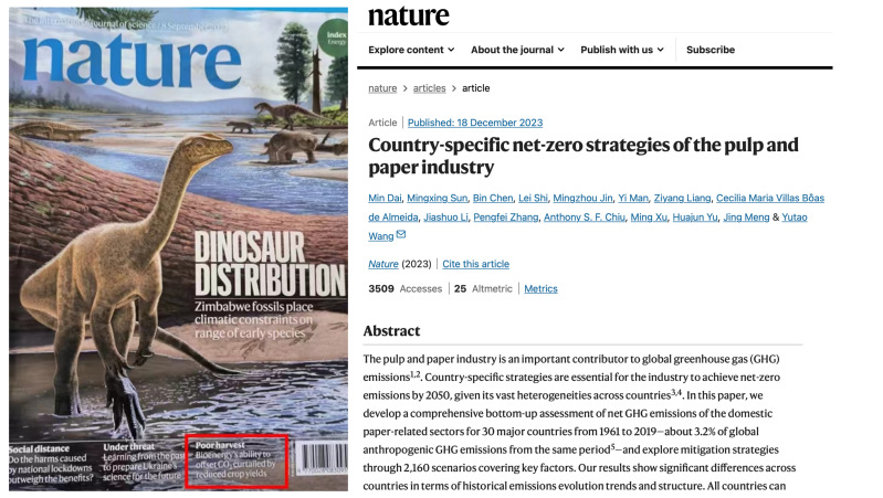 2023年12月,王玉涛教授团队领衔与合作者在Nature发表研究论文“Country-specific net-zero strategies of the pulp and paper industry”,揭示全球主要造纸生产与消费国家造纸行业温室气体排放特征,提出了2050年不同国家实现该行业净零排放目标的差异化策略。