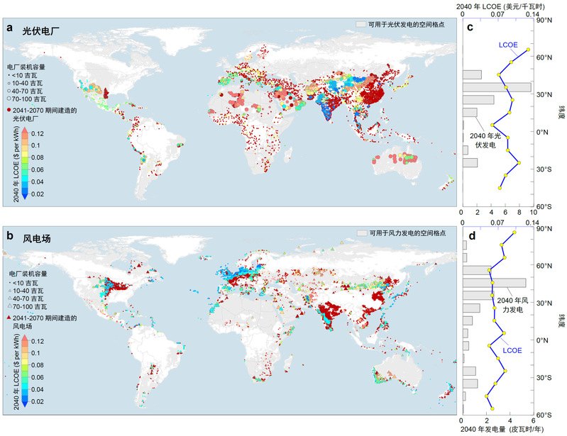 该模型使用了时空高分辨的地理空间数据以及消费端电力负荷的小时波动数据,结合了可再生能源的技术进步、电力运输、能源储存、国际贸易和供应链等影响,考虑了光伏和风力发电与其他清洁发电技术的竞争关系,考虑了生产光伏面板与风机的矿物限制,提出了在全球192个国家建造光伏、陆上风电和海上风电厂的方案,在实现2040年电力系统二氧化碳净零排放的目标下,全球2040年光伏、陆上风电和海上风电的总发电量将分别达到21.7、14.7和2.3 PWh y-1,揭示了全球风光发电减排二氧化碳的巨大潜力(图2)。