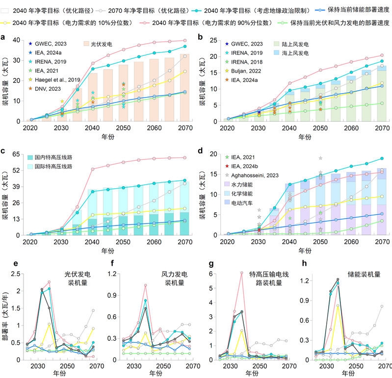 研究分析了影响风光发电潜力的主要因素,通过电力系统升级,可提高大洋洲、中东、非洲和欧洲对全球二氧化碳减排量的贡献,并降低固定成本、变压器、电缆、土地、特高压站连接和运维对总成本的贡献。从全球范围来看,研究结果强调了在整合高比例的可变可再生能源时,扩大储能和电力传输以维持电网稳定的重要性。在 2070 年实现净零目标时,2021-2040 年的年安装率与 2021-2023 年的历史安装率接近,但在 2040 年实现净零目标时,需要进一步提高风光电力系统的安装速度(图3)。